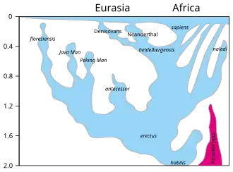 Se cree que el género Homo se originó hace unos dos millones de años, desde el descubrimiento de herramientas de piedra en Olduvai Gorge, Tanzania, en la década de 1960. Homo habilis sería la primera especie "humana" (miembro del género Homo) por definición, siendo su espécimen tipo los fósiles OH 7. Sin embargo, el descubrimiento de más fósiles de este tipo ha abierto el debate sobre la delimitación de H. habilis del Australopithecus. Especialmente, el fósil de mandíbula LD 350-1 descubierto en 2013, fechado en 2.8 millones de años, se ha argumentado como una transición entre los dos.[10] También se discute si H. habilis fue el primer homínido en utilizar herramientas de piedra, se han encontrado Australopithecus garhi, fechado en 2,5 millones de años junto con herramientas de piedra.[11] El fósil KNM-ER 1470 (descubierto en 1972, designado Pithecanthropus rudolfensis por Alekseyev 1978) se considera ahora como una tercera especie temprana de Homo (junto con H. habilis y H. erectus) hace aproximadamente 2 millones de años, o alternativamente como una transición entre Australopithecus y Homo.[12]