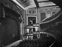 A cada lado del escenario hay una sección de pared con dos palcos en cada nivel del primer y segundo balcón.[28]Cada sección de pared está flanqueada por paneles de estilo Adam. Los propios palcos son curvos y contienen celosías y decoraciones de camafeo en las barandas frontales. Debajo de cada palco hay una moldura y un medallón que sostiene una araña. Sobre cada par de palcos del segundo balcón, hay un arquitrabe con orejas, así como un panel de celosía que representa figuras femeninas flanqueando guirnaldas y una cartela.[33] Originalmente, el auditorio tenía doce palcos (cuatro en cada nivel),[11] pero los palcos a nivel de orquesta fueron eliminados.[28] En lugar de un foso de orquesta, había un órgano Wurlitzer que un solo músico podía tocar.[11] [6] El órgano era un modelo Opus 20 con tres manuales y trece rangos.[35]