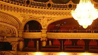 Presenta diversos adornos de interés, como la cúpula con alegorías de Ernesto Kirchbach,[19] un sinfín de cariátides (incluso en la misma sala principal) y una gran lámpara de cristal de 14.300 cristales y 4 metros de alto.[20] Su telón, el cuarto en su historia, pesa más de 1200 kilos en terciopelo rojo, tal como el original.
