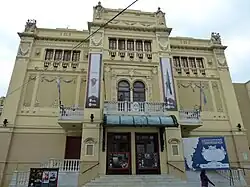 La fachada de estilo Belle Epoque (1900) es de una organización clara y simétrica, dividida en 3 niveles coronados por un friso con esculturas alegóricas. El acceso al hall se efectúa por una escalinata de mármol cuyo descanso es protegido por una marquesina de hierro bellamente trabajada que soporta el balcón central, jerarquizando ambos la entrada principal. El hall del teatro es de reducidas dimensiones, con paredes revestidas de mayólicas en tonos ocres y tierra, iluminados por hermosos apliques de bronce cuyo tema principal es una máscara leonina con las fauces abiertas. Se destaca la gran araña central del mismo estilo y material. La planta del edificio se estructura a partir de la forma en herradura de la platea, rodeada por los palcos bajos y tertulias, superponiéndose 3 niveles: los palcos altos, la cazuela y el paraíso, soportados por columnas corintias. El frente de los palcos está decorado con máscaras y guirnaldas alusivas al arte teatral.