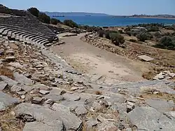 Las ruinas del teatro se encuentran en la ladera sur del cerro conocido hoy como Velatoúri. La tribuna del teatro es alargada en el medio y curvada en ambos extremos. Se abre al suroeste y su anchura es de unos 55 metros. La orquesta del teatro tiene forma ovalada y mide aproximadamente 16 × 30 metros o unos 443 metros cuadrados.