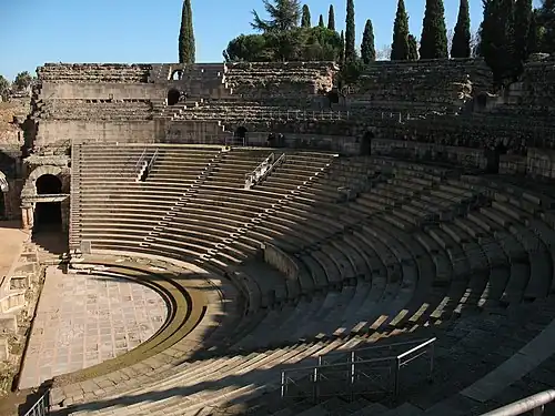 El teatro romano de Mérida es un teatro histórico levantado por la Antigua Roma en la colonia Augusta Emerita, actual Mérida (España). Su creación fue promovida por el cónsul Marco Vipsanio Agripa y, según una fecha inscrita en el propio teatro, su inauguración se produjo hacia los años 16-15 a. C. «Príncipe entre los monumentos emeritenses», como lo denominó el arquitecto José Menéndez-Pidal,[1] el teatro es Patrimonio de la Humanidad desde 1993 como parte del conjunto arqueológico de Mérida.