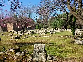 - ↑ a b c Stillwell, Richard; MacDonald, William L. (1976). «Olympia, Greece». En McAllister, Marian Holland, ed. The Princeton Encyclopedia of Classical Sites (en inglés) (Princeton, N. J.: Princeton University Press). Consultado el 12 de junio de 2024.