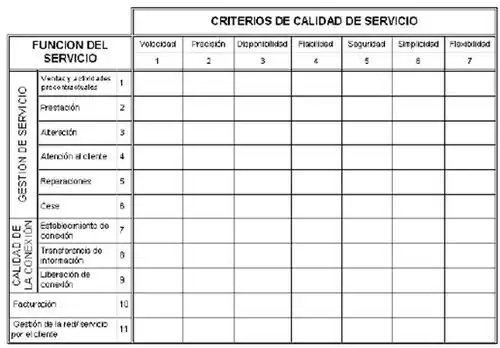 Obtención y definición de las necesidades de QoS del usuario/cliente: Los criterios de calidad de un servicio de telecomunicación se pueden derivar a partir de la matriz que se presenta en la figura de a continuación. La matriz fue el resultado de un estudio realizado por la Federación de Ingenieros de Telecomunicaciones de la Comunidad Europea (FITCE, Federation of Telecommunications Engineers of the European Community) y fue acogida por el Instituto Europeo de Normas de Telecomunicación (ETSI, European Telecommunications Standardization Institute) y por la UIT-T para la aplicación de telefonía básica, pero puede ser utilizada para cualquier servicio de telecomunicaciones.