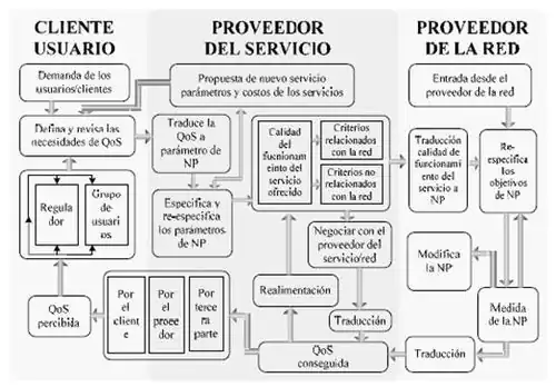 Necesidades de QoS del cliente: Las necesidades de QoS del usuario/cliente definen el nivel de calidad que se exige en un determinado servicio, y se pueden expresar en lenguaje corriente. Al cliente no le interesa saber cómo se presta el servicio ni los aspectos del diseño interno de la red, pues solo le importa la calidad total del servicio de extremo a extremo.