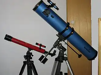 En cuanto a los telescopios reflectores, que utilizan un espejo curvo en vez de una lente como objetivo, su base teórica por entonces todavía estaba muy por delante de sus logros prácticos. La base teórica de los espejos curvos, similar a la de las lentes, fue probablemente establecida por Alhazen, cuyos tratados habían sido ampliamente difundidos gracias a las traducciones latinas de su trabajo.[12] Poco después de la invención del telescopio refractor galileano, Giovanni Francesco Sagredo y otros estudiosos de la época, impulsados por su conocimiento de que los espejos curvos tienen propiedades comparables a las de las lentes, comenzaron a escribir sobre la idea de construir un telescopio que utilizase un espejo como objetivo para formar imágenes.[13] Las ventajas potenciales de utilizar espejos parabólicos (principalmente, una reducción de la aberración esférica y la total eliminación de la aberración cromática) llevó a distintos estudiosos a proponer diseños de telescopios reflectores.[14] Uno de los diseños más notables fue publicado en 1663 por James Gregory, que pasaría a denominarse telescopio gregoriano en su honor. Sin embargo, todavía no se disponía de los materiales ni de los medios técnicos necesarios para afrontar este reto, que inicialmente se saldó con un completo fracaso.[15][16] Cinco años después, en 1668, Isaac Newton fue por fin el primero en construir telescopios reflectores prácticos, denominados telescopios newtonianos.[17] A pesar de las dificultades de construcción y del pobre rendimiento de los espejos de speculum (un tipo de bronce de mediano poder reflexivo, muy maleable, pero propenso a empañarse por oxidación), estos telescopios se hicieron muy populares entre los astrónomos durante los cien años siguientes. Los siglos siguientes presenciaron notables avances técnicos en los telescopios reflectores, como el perfeccionamiento del espejo parabólico en el siglo XVIII,[18] el plateado de espejos de vidrio en el siglo XIX,[19] los recubrimientos de aluminio (mucho más duraderos) en el siglo XX, o los espejos segmentados para obtener diámetros más grandes y la óptica activa para compensar las deformaciones causadas por la gravedad. Una innovación de mediados del siglo XX fueron los telescopios catadióptricos, como la cámara Schmidt, que utiliza una lente (placa correctora) en combinación con un espejo como elementos ópticos primarios, principalmente utilizados para la obtención de imágenes de gran amplitud de campo sin aberración esférica.