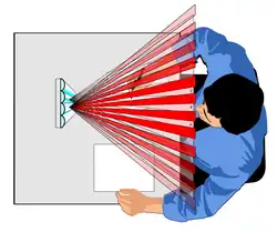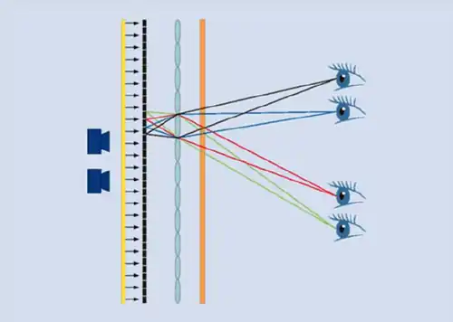 la capa con una matriz de lentes transparentes y cilíndricas están fijadas sobre la pantalla. La transparencia de esta capa es un factor limitador para el contraste y el brillo que el monitor pueda representar. Mientras que con un ojo percibimos una parte de la pantalla, con el otro, que observa desde un ángulo diferente, observaremos otra parte dirigida hacia el otro ojo. Entonces podemos decir que, para el observador, cada píxel observado es una lente, pero estas están subdivididas en subpíxeles. Para crear el efecto 3D se tiene que representar la información sobre cada subpíxel. La visión múltiple se consigue cuando una lente se coloca solapando un grupo de subpíxeles, enviando la información de cada subpíxel en una dirección diferente.