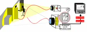 El Time-Of-Flight (tiempo de vuelo) es un método para extraer la información de profundidad de una única imagen para que así podamos crear una visión estéreo (no confundir con visión 3D). El TOF consiste en que la cámara emite una señal modulada en el espectro infrarrojo, sobre los 20 MHz o mayor. Esta señal incide sobre la escena y vuelve rebotada sobre la cámara. Cada píxel de la cámara puede demodular esta señal y, a través de su fase, detectar la distancia. La cámara genera una imagen en escala de grises que nos da la información de profundidad.