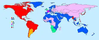 En principio, los tres sistemas de codificación del color pueden utilizarse con cualquier combinación de línea de exploración/velocidad de fotogramas. Por lo tanto, para describir completamente una señal determinada, es necesario citar el sistema de color más la norma de emisión en mayúsculas. Por ejemplo, Estados Unidos, Canadá, México y Corea del Sur utilizan NTSC-M,[nota 1] Japón utiliza NTSC-J,[nota 2] el Reino Unido utiliza PAL-I,[nota 3] Francia utiliza SECAM-L,[nota 4] gran parte de Europa Occidental y Australia utilizan PAL-B/G,[nota 5] la mayor parte de Europa Oriental utiliza SECAM-D/K o PAL-D/K, etc.