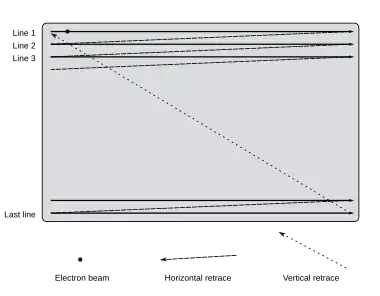 Un televisor de tubo de rayos catódicos (TRC) muestra una imagen mediante el barrido de un haz de electrones a través de la pantalla en un patrón de líneas horizontales conocido como trama. Al final de cada línea, el haz vuelve al principio de la línea siguiente; al final de la última línea, el haz vuelve al principio de la primera línea en la parte superior de la pantalla. Al pasar por cada punto, la intensidad del haz varía, variando la luminancia de ese punto. Un sistema de televisión en color es similar, salvo que hay tres haces que escanean juntos y una señal adicional conocida como crominancia controla el color del punto.