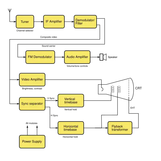 La mayor parte de los circuitos del receptor (al menos en los diseños basados en transistores o circuitos integrados) funcionan con una fuente de alimentación de CC de tensión comparativamente baja. Sin embargo, la conexión del ánodo de un tubo catódico requiere una tensión muy alta (normalmente 10-30 kV) para funcionar correctamente.