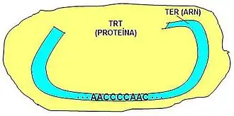 - Componente proteico: es la parte de la enzima que contiene la capacidad transcriptasa inversa (TRT o TERT de telomerase reverse transcriptase); invierte el curso normal de la información (ADN hacia ARN), trascribiendo el ARN a ADN. Dicha transcripción inversa en los telómeros es la actividad telomerasa propiamente dicha. La transcriptasa inversa de virus y el resto de ADN polimerasas necesitan un cebador para sintetizar ADN, sin embargo, la telomerasa no necesita dicho cebador.