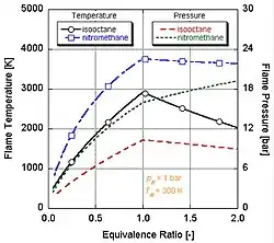 En la siguiente figura se observa por qué el nitrometano (CH3NO2) se utiliza a menudo para proporcionar energía a los vehículos. Dado que cada mol de nitrometano contiene dos moles de oxígeno, este puede arder a altas temperaturas porque proporciona su propio oxidante junto con el combustible. Esto a su vez permite que se alcance más presión durante un proceso a volumen constante. Cuanto mayor sea la presión, más fuerza sobre el pistón se genera, produciendo más trabajo y más potencia en el motor. Es interesante observar que el nitrometano ya contiene su propio oxidante en la estequiometría. Sin embargo, el funcionamiento continuo de un motor alimentado con nitrometano finalmente funde el pistón y/o cilindro debido a esta temperatura más alta.