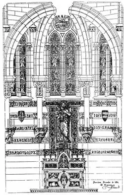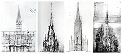 El proyecto fue encargado en primer lugar al arquitecto diocesano Francisco de Paula del Villar y Lozano, quien tras varios proyectos sucesivos ideó un conjunto neogótico y desechó la idea de Bocabella de hacer una réplica del santuario de Loreto.[23] El proyecto de Villar consistía en una iglesia de tres naves, de 44 × 97 m,[24] con los elementos típicos del gótico, como los ventanales alveolados, los contrafuertes exteriores y un alto campanario en forma de aguja, que habría llegado a los 100 m de altura.[25]
