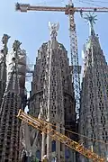 Cuando, en 1944, se decidió continuar la construcción de la Sagrada Familia, tuvo que definirse en primer lugar cómo debía procederse para edificar el templo de la forma más fiel a las ideas de Gaudí. Al frente de esta gigantesca tarea estuvieron los arquitectos Bonet, Quintana y Puig Boada, mientras que de la obra escultórica se encargaron Jaume Busquets y diversos escultores más. Las obras se reanudaron el 30 de junio de 1948, con una pequeña ceremonia consistente en la celebración de una misa en la cripta y un acto presidido por los miembros de la Junta Constructora en el ventanal del crucero, el primero en ser abordado en esta nueva fase.[50] El impulso definitivo se produjo en 1953, gracias a la publicación de una carta pastoral del obispo de Barcelona, Gregorio Modrego, en que expresaba su deseo de acelerar las obras; al año siguiente, la Junta Constructora decidió levantar la segunda fachada, la de la Pasión, sufragada gracias a donativos, colectas anuales y el inicio de la entrada de visitantes a las obras. Las torres de la fachada fueron culminadas en 1976.[51] El conjunto principal de las figuras escultóricas de la nueva fachada le fue encargado en 1987 a Josep Maria Subirachs. Igualmente, el escultor japonés Etsuro Sotoo colaboró en algunas esculturas de la fachada del Nacimiento, las cestas de frutas de los ventanales exteriores y la restauración de las esculturas de la puerta del Rosario. Desde 1987 hasta 2012, las obras estuvieron bajo la dirección de Jordi Bonet i Armengol, fecha en que fue sustituido por Jordi Faulí i Oller.[52] En 1987 se iniciaron las obras de las naves del templo; en el año 2000 se cubrió la nave central y, en 2010, acabó de cubrirse todo el templo.[53]
