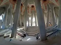 Desde 1915, Gaudí se dedicó prácticamente en exclusiva a la Sagrada Familia, que supone la síntesis de toda la evolución arquitectónica del arquitecto. Después de la realización de la cripta y el ábside, todavía en estilo neogótico, el resto del templo lo concibió en un estilo orgánico, que imita las formas de la naturaleza, donde abundan las formas geométricas regladas. El interior debía semejar un bosque, con un conjunto de columnas arborescentes inclinadas, de forma helicoidal, que crean una estructura a la vez simple y resistente. Gaudí aplicó en la Sagrada Familia todos sus hallazgos experimentados anteriormente en obras como el parque Güell o la cripta de la Colonia Güell y consiguió elaborar un templo estructuralmente perfecto a la vez que armónico y estético.