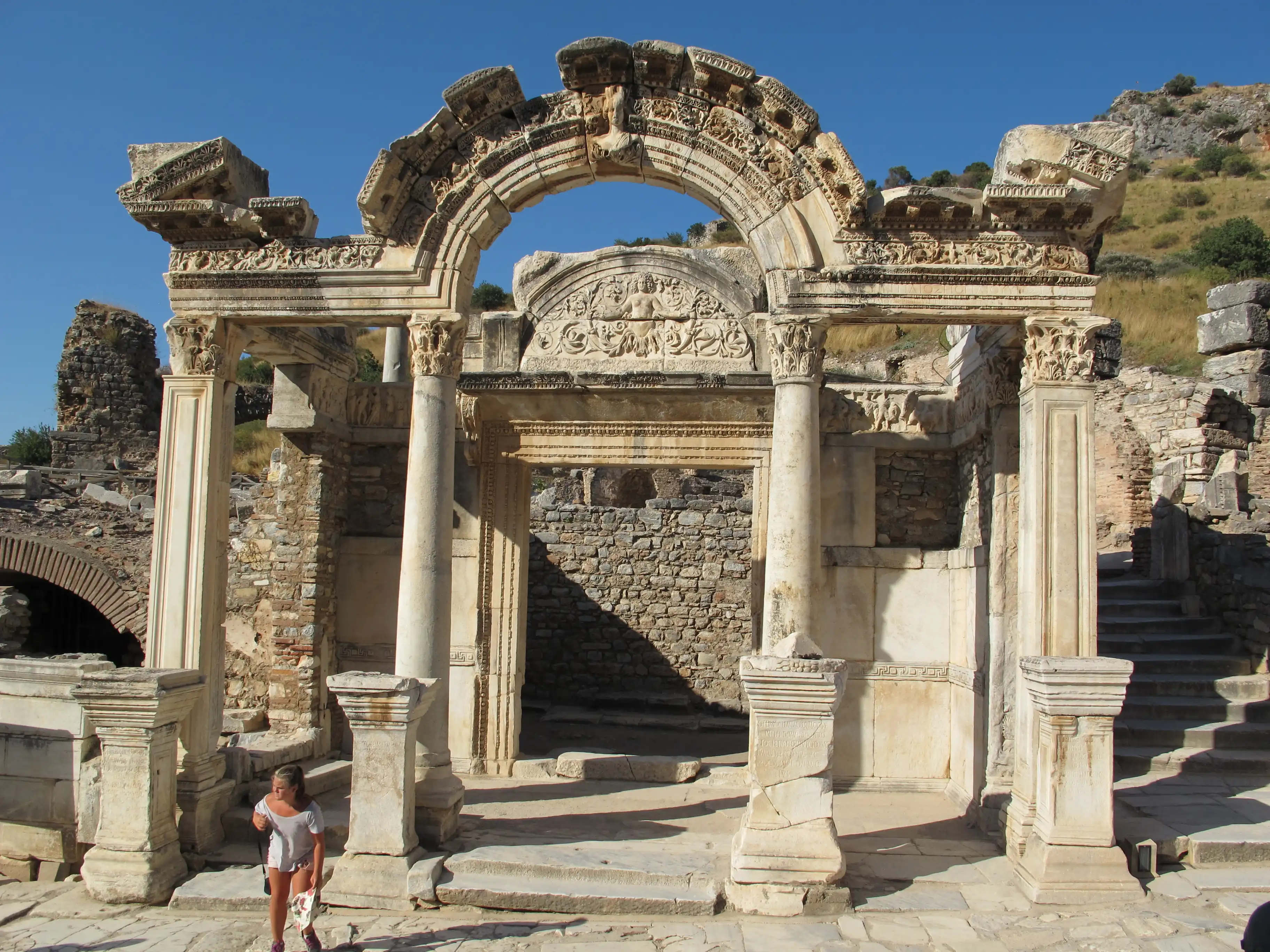 - ↑ Zum Fries: Robert Fleischer: Der Fries des Hadrianstempels in Ephesos. In: Festschrift für Fritz Eichler zum achtzigsten Geburtstag, dargebracht vom Österreichischen Archäologischen Institut. Wien 1967, S. 23–71; Beat Brenk: Die Datierung der Reliefs am Hadrianstempel in Ephesos und das Problem der tetrarchischen Skulptur des Ostens. In: Istanbuler Mitteilungen 18, 1968, S. 238–258.