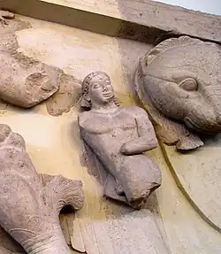 Detrás del leopardo de la izquierda se encuentra una figura sentada. Se demostró que la figura era atacada por una figura que empuñaba una lanza, que ha desaparecido del frontón.