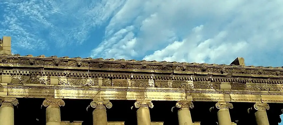 - ↑ Arakelyan, Babken (1968). «Excavations at Garni, 1949–1950». En Alekseyev, Valery, ed. Contributions to the archaeology of Armenia. Cambridge, Massachusetts: Peabody Museum of Archaeology and Ethnology. p. 22. «The temple is peripteral, built on a high podium, with 24 Ionic columns, 6 in front and back and 8 at each side; the corner columns are listed twice. It is constructed of gray basalt quarried at Garni.»