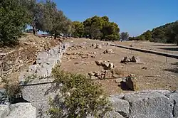 El monumento a Demóstenes era posiblemente una estructura circular situada en el lado oeste del templo.[1] Cerca del santuario, pero fuera de él en el lado suroeste, había una quinta estoa, que servía como buleuterio de la ciudad, y un edificio cuadrado llamado el heroon.[3][7]