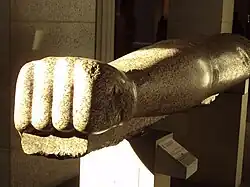 Encontrado en 1854 por Joseph Hekekyan, este monolito colosal fue usurpado por Ramsés IV de la dinastía XX. Dividido en tres partes, se mantuvo siempre en la palma de Mit Rahineh, que constituyen con el coloso recostado de Ramsés II y la gran esfinge de alabastro los únicos restos visibles del antiguo templo de Ptah.[11]