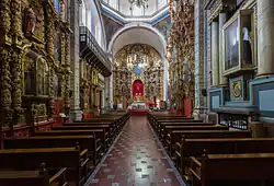 En el interior de la parroquia, la nave va de este a oeste, cubierto por una bóveda de cañón.[3] La cúpula está pintada con imágenes de los fundadores de la iglesia como San Agustín, San Jerónimo, San Gregorio y San Ambrosio.[5] Al extremo del lado oeste de la nave se encuentra el altar principal. Debido a la forma acampanada que tiene, el área del altar principal puede describirse como un nicho que contiene otros nichos.[5] El altar principal está hecho de madera dorada en honor al estilo churrigueresco.[3] Las figuras que se encuentran en el altar principal incluyen a Antonio de Padua y los cuatro evangelistas. Los nichos interiores contienen imágenes de los santos Domingo y Francisco de Asís, quien también está representado en uno de los medallones en la parroquia. En el centro, hay un lienzo representando el nacimiento de la Virgen María y encima una escultura de San José. El altar principal está enmarcado por la pirámide invertida más conocido como pilastra.[5][10] Un nicho particularmente importante en la parroquia es dorado, adornado con espejos, concha de tortuga y nácar. Contiene una escultura de la Inmaculada Concepción del siglo XIX. En la parte de arriba del altar, hay una representación de Dios Padre sosteniendo el mundo en sus manos.[10]