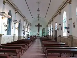 Su interior es una amplia nave rectangular con decorado austero, en la que se aprecian algunas imágenes a los costados y ocho columnas semi empotradas en las dos paredes laterales, al frente tiene una gran cruz de mármol con un pequeño Cristo crucificado y a su lado una imagen de la Inmaculada Concepción.