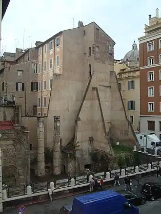 Los restos de la via delle Botteghe Oscure se encontraron en 1938 y quedaron visibles al costado de la calle moderna; dos de las columnas fueron vueltas a levantar en 1954. Estos restos permiten identificar diferentes fases de la construcción del edificio: el núcleo de opus caementicium en el interior del podio data del siglo II a. C., las basas de las columnas y las molduras del podio actualmente visibles se han fechado a mediados del siglo I a. C.[6] y los elementos arquitectónicos de mármol, aún conservados en la zona, entre ellos un friso-arquitrabe con instrumentos sacrificales, de la época de Domiciano, quizás testimonio de una restauración tras el incendio del año 80.