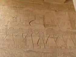 Las ceremonias de los festivales incluían la recreación de pasajes mitológicos o la realización de otros actos simbólicos, como la siega del trigo durante el festival de la cosecha dedicado al dios Min.[166] Ceremonias como esta tenían lugar solo dentro del recinto del templo, pero otros festivales implicaban la visita al templo del dios u otro, ocasión en la que se celebraba el festival procesional, cuando los sacerdotes portaban la imagen divina dentro de la barca en un viaje que se podía hacer enteramente por tierra o implicar el embarque en un navío real para navegar por el Nilo.[167]