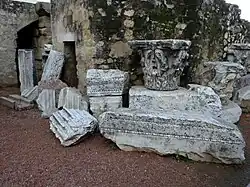 Alrededor pueden verse algunos fragmentos originales del templo, tales como piezas de tambores o capiteles. Otros restos fueron llevados al Museo Arqueológico y Etnológico de Córdoba para su mejor conservación, como algunos relieves que allí se exponen, y donde también se hallan algunos de sus capiteles, mientras que varios fustes de sus columnas se pueden observar en la plaza de las Doblas.