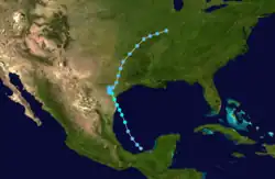 La parte sur de una vaguada fuerte se convirtió en una depresión tropical en el Golfo de Campeche el 22 de junio. Se movió hacia el noroeste, y se fortaleció en una tormenta tropical al día siguiente y golpeó a 50 km (31,07 mi) al sur de Corpus Christi, Texas como una tormenta con vientos de 70 km/h (43,5 mph). La tormenta hizo un bucle al sur de Texas, y dejó fuertes lluvias sobre el área. Se movía lentamente hacia el norte, y finalmente se disipó sobre Illinois el día 29. Aunque débil, la tormenta causó $ 3,6 millones en daños (1960 dólares) y 15 muertes.
