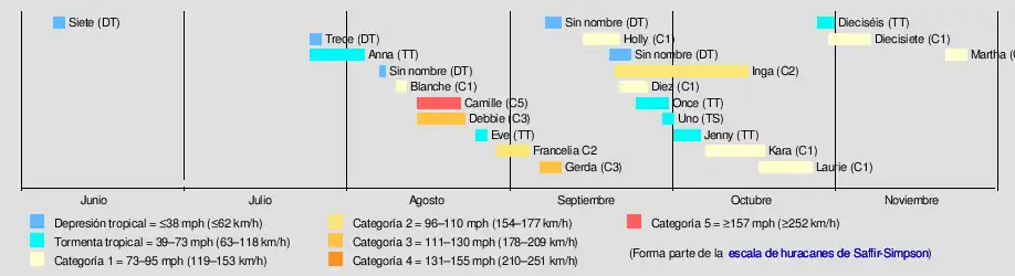 La ciclogénesis tropical comenzó temprano, con una depresión tropical que afectó a Jamaica. La actividad estuvo brevemente inactiva entre el 15 de junio y el 25 de julio, cuando se originó la siguiente depresión. Ese mismo día, la primera tormenta con nombre de la temporada, Anna, se desarrolló sobre el Atlántico oriental. Hubo cinco ciclones tropicales que se formaron en el mes de agosto: Blanche, Camille, Debbie, Eve y Francelia . Camille fue el ciclón tropical más intenso de la temporada, con un pico de huracán de categoría 5 con vientos máximos sostenidos de 175 mph (280 km/h) y una presión barométrica mínima de 900 mbar (27 inHg).