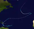 Una onda tropical salió de la costa oeste de África el 24 de septiembre y durante varios días mantuvo una trayectoria general hacia el oeste. El 30 de septiembre, un vuelo de los Hurricane Hunters observó una circulación bien definida, mientras que los barcos en el área reportaron vientos huracanados; estas observaciones indicaron que se había desarrollado una tormenta tropical. La tormenta se desplazó hacia el oeste-suroeste, pasando por Santa Lucía y San Vicente hacia el mar Caribe el 2 de octubre. A partir de entonces, se debilitó y degeneró brevemente en una vaguada antes de volver a desarrollarse en una depresión tropical el 5 de octubre. Se volvió a intensificar hasta convertirse en una tormenta tropical. mientras serpenteaba al sur de Hispaniola, y finalmente golpeó la República Dominicana el 8 de octubre como depresión tropical. Cruzó la isla hacia el Atlántico y se movió hacia el noreste por delante de un frente frío que se aproximaba. convirtiéndose brevemente en tormenta tropical nuevamente el 10 de octubre. La tormenta se volvió extratropical cuando se integró con la vaguada el 11 de octubre, moviéndose rápidamente hacia el este y el este-noreste. Las tormentas eléctricas aumentaron el 14 de octubre y, un día después, se estancaron a mitad de camino entre las Azores y Madeira debido a una cresta sobre el norte de Europa. En ese momento, el sistema se integró con un bajo de nivel superior mientras que ya no estaba asociado con el frente; como resultado, se convirtió en una tormenta subtropical. Volviendo hacia el oeste, la tormenta se volvió a intensificar y se convirtió en un huracán completamente tropical el 17 de octubre. Un día después, alcanzó vientos máximos de 85 mph (135 km / h). El huracán giró hacia el norte, debilitándose nuevamente a tormenta tropical el 20 de octubre. Un día después, se transformó en un ciclón extratropical,