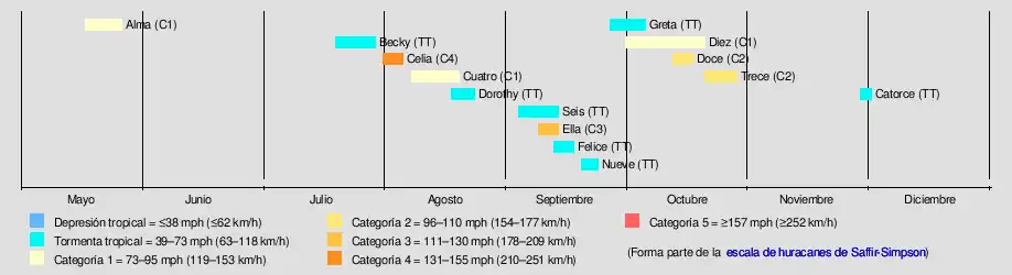 La ciclogénesis tropical comenzó en mayo y Alma se desarrolló el 17 de mayo. No se produjo actividad de ciclones tropicales en junio. Tres sistemas se originaron en julio, incluida la tormenta tropical Becky y la depresión que finalmente se intensificaría hasta convertirse en el huracán Celia , así como otra depresión tropical que permaneció por debajo de la intensidad de la tormenta tropical. Celia se convirtió en el ciclón tropical más intenso de la temporada el 3 de agosto, con un pico de huracán de categoría 3 en la escala Saffir-Simpson con vientos máximos sostenidos de 125 mph (205 km/h) y una presión barométrica mínima de 945 mbar (27,91 inHg ). En agosto, se desarrollaron cinco sistemas tropicales, incluidas dos tormentas tropicales sin nombre, Dorothy , y otras dos depresiones tropicales. El ocho de septiembre presentó depresiones tropicales, aunque solo tres se convirtieron en tormentas con nombre: Ella , Felice y Greta. Octubre presentó dos huracanes sin nombre, el segundo de los cuales se convirtió en un ciclón extratropical el 28 de octubre, poniendo fin a la actividad de la temporada.