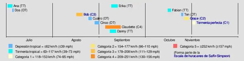 La tormenta más importante de la temporada fue el huracán Bob, que en su momento se encontraba entre los diez huracanes más costosos de Estados Unidos. Tras rozar los Outer Banks de Carolina del Norte y Long Island en Nueva York, el huracán tocó tierra en Rhode Island. Causó daños por valor de 1.500 millones de dólares (USD de 1991)[nb 2], principalmente en Massachusetts, y 17 víctimas mortales. El huracán más potente de la temporada fue Claudette, que alcanzó vientos máximos de 210 km/h (130 mph) cerca de Bermudas. Pasó cerca de la isla, pero no causó daños. Fabián fue la única tormenta tropical que se movió sobre o cerca de Cuba o Florida, produciendo fuertes lluvias, pero sin daños. El huracán Grace, la última tormenta con nombre de la temporada, proporcionó la energía que condujo al desarrollo de una poderosa tormenta del noreste conocida como la Tormenta Perfecta. Originada a partir de una tormenta extratropical, la Tormenta Perfecta se intensificó mientras se desplazaba hacia el oeste, rumbo a Nueva Inglaterra, dejando 200 millones de dólares en daños y causando daños costeros desde Puerto Rico hasta Florida y hacia el norte a través de Canadá. Posteriormente se transformó en huracán sobre la Corriente del Golfo y finalmente se disipó sobre Nueva Escocia el 2 de noviembre.