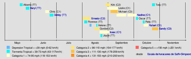La ciclogénesis tropical comenzó en el mes de mayo, con las tormentas tropicales Alberto y Beryl.[14] Esta fue la primera aparición de dos tormentas tropicales de pretemporada en el Atlántico desde 1951.[15] Además, Beryl es considerado como el ciclón tropical más fuerte registrado de pretemporada en los Estados Unidos. En junio, también hubo dos sistemas, el Huracán Chris y la Tormenta tropical Debby. Sin embargo, no se desarrollaron ciclones tropicales en el mes de julio, la primera ocurrencia desde la temporada de 2009 . La actividad se reanudó el 1 de agosto, con el desarrollo del Huracán Ernesto. Con un total de ocho tormentas tropicales en agosto, esto empata el récord establecido en 2004.[16]