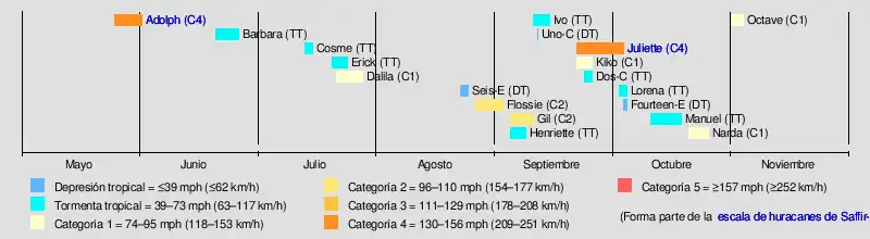 | Juliette | 21 de septiembre – 3 de octubre | Huracán categoría 4 | 230 (145) | 923 | 24.8 | Puerto San Carlos, Baja California Sur | 9 de septiembre | 65 (40) | $400 millones | 12 |
