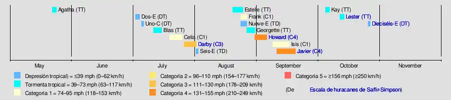 El impacto a lo largo de la temporada fue mínimo y no se reportaron ningún cifras de muertes. A principios del mes de agosto, los remanentes del huracán Darby ayudaron a la lluvia localizada en Hawái, causando inundaciones menores en las calles y arroyos; El café y los árboles de macadamia también fueron dañados. A principios de septiembre, el huracán Howard provocó importantes inundaciones en la península de Baja California que dañaron las tierras agrícolas y 393 viviendas. Grandes oleajes también resultaron en aproximadamente 1,000 rescates de salvavidas en California. A mediados del mismo mes, Javier provocó la desaparición de tres pescadores y ayudó a una sequía de varios años en el suroeste de los Estados Unidos. Produjo precipitaciones récord en el estado de Wyoming. Entre mediados y finales de octubre, la tormenta tropical Lester y la depresión tropical Deciseis-E causaron inundaciones localizadas; este último puede haber producido un tornado cerca de Culiacán, México.