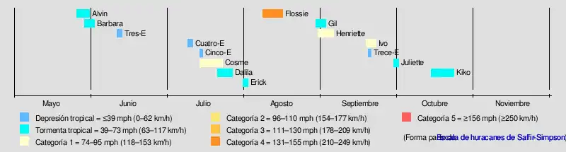 El impacto durante la temporada fue relativamente mínimo. A principios de junio, la tormenta tropical Barbara se movió a tierra justo al noroeste de la frontera México-Guatemala, causando daños por $ 55 millones (2007 USD) y cuatro fallecimientos totales. A fines de julio, Cosme pasó al sur de la isla de Hawái como una depresión tropical debilitada; lluvia liviana y aumento de olas como resultado. Unos días más tarde, Dalila pasó frente a la costa del suroeste de México, matando a 11 y causando daños mínimos.