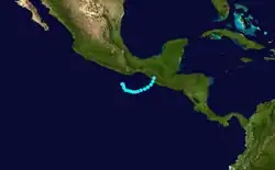 El 24 de mayo, una onda tropical surgió en la costa occidental de África. La ola entró al Pacífico oriental alrededor del 6 de junio y la lluvia y la actividad de tormentas eléctricas comenzaron a aumentar poco después. Una gran área de baja presión se formó a unos cientos de millas al sur de Acapulco, México, dos días después.[21] Después de la evidencia satelital de una circulación bien definida y actividad convectiva organizada,[22] el Centro Nacional de Huracanes mejoró la perturbación a una depresión tropical a las 12:00 UTC del 11 de junio. Después de alcanzar vientos de 35 mph (55 km/h) y una presión barométrica mínima de 1004 mbar (hPa; 29,65 inHg), la depresión comenzó a atravesar aguas más frías y aire mucho más estable. Esto causó que todas las convecciones asociadas se desvanezcan, y la depresión degeneró a un remanente no convectivo bajo a las 00:00 UTC del 13 de junio. El remanente bajo continuó hacia el noroeste hasta la disipación a las 06:00 UTC del 15 de junio.