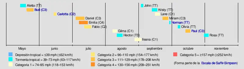 La actividad comenzó con la formación de la tormenta tropical Aletta, que se convirtió en la primera tormenta fuera de la temporada desde el huracán Alma en 1990. Después de la disipación de Aletta, se formó el huracán Bud se intensificó y se convirtió en el primer gran huracán de la temporada, uno de los tres que lo hicieron en el mes de mayo. A mediados de junio, el huracán Carlotta tocó tierra cerca de Puerto Escondido en México. Siete personas fallecieron por los efectos del Carlotta y los daños ascendieron a US$ 12,4 millones. El huracán Paul causó daños significativos en Baja California Sur. En general, esta temporada fue drásticamente menos activa y destructiva que en los años anteriores, causando alrededor de $27.9 millones en daños y ocho víctimas mortales.