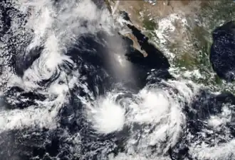 El 3 de agosto, el Centro Nacional de Huracanes (NHC) comenzó a monitorear una perturbación tropical muy al sur de la península de Baja California y al oeste de otra perturbación en desarrollo.[44] Al día siguiente, el sistema se convirtió rápidamente en la depresión tropical 5-E.[45] El ciclón recién formado se fortaleció y se convirtió en la tormenta tropical Emilia a principios del 5 de agosto.[46] La perturbación al este de Emilia se convirtió en la tormenta tropical Fabio el mismo día, y los ciclones comenzaron a interactuar entre sí.[47] Emilia fue ganando fuerza y se convirtió en la tormenta dominante en su interacción con Fabio. Después de moverse inicialmente hacia el sur, la tormenta gradualmente giró hacia el oeste y luego hacia el norte alrededor de Fabio.[48][49] Emilia alcanzó su máxima intensidad a primera hora del 7 de agosto, con vientos máximos sostenidos de 115 km/h (70 mph) y una presión central mínima de 29,2 inHg (988 mbar).[50] Más tarde ese día, Emilia absorbió los restos de Fabio mientras aceleraba hacia el norte.[51] Emilia se dirigió hacia aguas más frías y comenzó a debilitarse rápidamente. La tormenta produjo poca convección organizada al día siguiente, cuando cruzó la isoterma de 24° C (75 °F) hacia temperaturas de superficie del mar (TSM) aún más frías.[52] La tormenta degeneró en un remanente de baja presión post tropical a las 03:00 UTC del 9 de agosto, a unas 980 millas (1580 km) al oeste del extremo sur de la península de Baja California.[53]