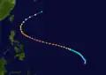 El 17 de marzo, un grupo de tormentas eléctricas se agrupó y formó un área de baja presión en el extremo este de las Islas Marianas. El área de baja presión se intensificó rápidamente y se convirtió en tormenta tropical cuatro días después de su formación. Las condiciones favorables permitieron que el sistema continuara intensificándose hasta convertirse en un tifón de categoría 1. La fuerte cizalladura del viento del 25 de marzo hizo que el sistema se debilitara y se transformó en un ciclón extratropical.