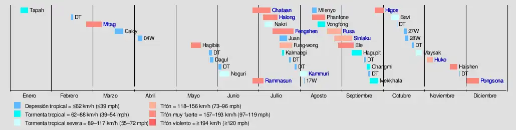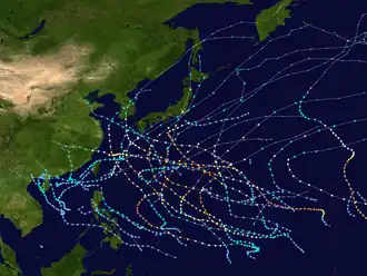 La actividad fue una temporada activa, con muchos ciclones tropicales que afectaron a Japón y China. Cada mes tuvo actividad tropical, con la mayoría de las tormentas formándose de julio a octubre. En total, hubo 44 depresiones tropicales declaradas oficialmente o extraoficialmente, de las cuales 26 se convirtieron en tormentas nombradas; de ellos, hubo 15 tifones, que es el equivalente a un huracán mínimo, mientras que 8 de los 15 tifones se intensificaron en supertifones extraoficialmente por el Centro Conjunto de Advertencia de Tifones (JTWC). La temporada comenzó temprano con la primera tormenta, Tapah, que se desarrolló el 10 de enero, al este de Filipinas. Dos meses después, el tifón Mitag se convirtió en el primer súper tifón registrado en marzo. En junio, el tifón Chataan dejó caer fuertes lluvias en los Estados Federados de Micronesia, matando a 48 personas y convirtiéndose en el desastre natural más mortífero en el estado de Chuuk.[nb 1] Chataan más tarde dejó graves daños en Guam antes de atacar a Japón. En agosto, el tifón Rusa se convirtió en el tifón más mortífero en Corea del Sur en 43 años, causando 238 muertes y $4.2 mil millones en daños.[nb 2] El tifón Higos de octubre fue el quinto tifón más fuerte que azotó Tokio desde la Segunda Guerra Mundial. El último tifón de la temporada fue el tifón Pongsona, que fue una de las tormentas más costosas registradas en Guam; causó daños por valor de 700 millones de dólares en la isla antes de disiparse el 11 de diciembre.