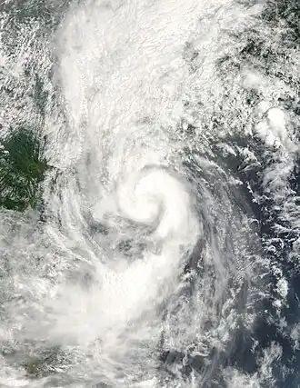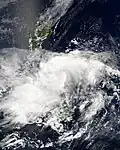 La primera tormenta de la temporada fue la tormenta tropical Tapah, que se formó el 9 de enero de 2002 cerca de Palaos.[2] Se desarrolló a partir de la vaguada del monzón y fue observado por primera vez por el Centro Conjunto de Advertencia de Tifones (JTWC) dos días antes de su formación.[3] El sistema inicialmente consistía en un área de convección con una circulación débil, ubicada en un área de cizalladura del viento débil.[19] El 10 de enero, la Agencia Meteorológica de Japón (JMA) clasificó el sistema como depresión tropical,[2] el mismo día en que la Centro Conjunto de Advertencia de Tifones (JTWC) inició avisos sobre la depresión tropical Uno-W y PAGASA lo clasificó como Agatón. La tormenta se movió hacia el oeste-noroeste debido a una cresta al norte, y el sistema gradualmente se fue organizando mejor.[19] El 12 de enero, la Agencia Meteorológica de Japón (JMA) actualizó la depresión a tormenta tropical Tapah, y ese mismo día estimó vientos máximos de 75 km/h (45 mph).[2] Alrededor de ese tiempo, Tapah desarrolló una característica ocular debajo de su convección, lo que llevó a Centro Conjunto de Advertencia de Tifones (JTWC) y PAGASA a estimar vientos máximos de 95 km/h (60 mph).[19] Una vaguada que se acercaba debilitó la cresta, que giró la tormenta hacia el noroeste. Debido al aumento de la cizalladura del viento,[3] la convección se debilitó gradualmente y la Agencia Meteorológica de Japón (JMA) degradó Tapah a depresión tropical el 13 de enero; sin embargo, otras agencias mantuvieron el sistema como tormenta tropical. Al día siguiente, Tapah se disipó a lo largo de la costa este de Luzón en Filipinas.[2][19]