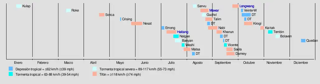 | Talim | Nabi | Khanun | Vicente | Saola | Damrey | Longwang | Kirogi | Kai-tak | Tembin | Bolaven |