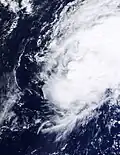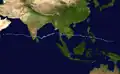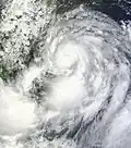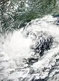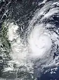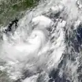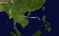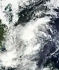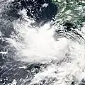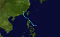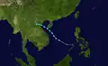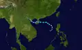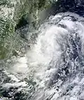 A las 12:00 UTC del día siguiente, la JMA asignó a este sistema como una tormenta tropical, nombrándolo Rumbia;[48] tres horas después lo hizo la PAGASA.[49] Sin embargo, una cizalladura de viento previno un futuro fortalecimiento de Rumbia, y la tormenta permaneció relativamente desorganizada hasta tocar tierra en Samar Oriental cefca del municipio de Hernani City a las 03:00 UTC del día siguiente.[50][51] En ese momento, la tormenta alcanzó un máximo de vientos de 65 km/h y una presión mínima de 1000 hPa.[52] Ya en el Mar de la China Meridional el 30 de junio, Rumbia se organizó, con unas bandas nubosas bien definidas alrededpr del centro. Sin embargo, una cizalladura de viento moderada desplazó a su forma convectiva hacia el suroeste.[53] Al paso del día, imágenes de satélite empezaron a detectar un ojo desarrollado, indicando una intensificación,[54] y a las 06:00 UTC del 1 de julio, la JMA clasificó la intensidad de Rumbia como Tormenta tropical severa; consecuentemente, el ciclón alcanzó su pico de intensidad de vientos en 10 minutos de 95 km/h con una presión mínima de 985 hPa.[55] Tres horas más tarde, la JTWC reclasificó al ciclón como un tifón de categoría uno.[56] Luego, el ciclón tropical se debilitó antes de moverse sobre la península de Leizhou. Debido a que al entrar en contacto con tierra, Rumbia rápidamente se debilitó a un área de baja presión el 2 de julio, y eventualmente se disipó horas más tarde.