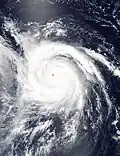 A partir del 23 de marzo, un área de baja presión persistió a 232 kilómetros al este-sureste de Majuro, islas Marshall.[73]​ Se desplazaba en dirección noroeste y, a su vez, adquiría organización sobre los siguientes dos días.[74]​ Fue declarado como una depresión tropical por la JMA, el 26 de marzo, y por la JTWC, el 27 de marzo, que lo denominó como Cuatro-W.[75][76][77]​ Cuando fue promovido a tormenta tropical horas más tarde por la JTWC, el sistema mostró bandas convectivas consolidándose a su centro de circulación de magnitud baja en medio de un ambiente de cizalladura de viento moderada compensado por un excelente frente de ráfaga.[78][79]​ A las 18:00 UTC la JMA lo declaró como la tormenta tropical Maysak (nombre aportado por Camboya que hace referencia a un árbol local).[80][7]​ El 28 de marzo, las imágenes procesadas de satélite revelaron un ojo rodeado de una nubosidad central densa en proceso de oscurización. Cuando el Maysak fue promovido a tormenta tropical severa, éste se desplazaba al oeste a lo largo de la periferia de una cresta subtropical.[81][82]​ El ojo se definió más con su nubosidad densa consolidada y una convección atmosférica profunda persistiéndo por el cuadrante inferior de la tormenta.[83]​ Estas observaciones permitieron que la JMA promoviera al Maysak a tifón a las 18:00 UTC del mismo día.[84]​ En un día, el tifón se intensificó lentamente y su pico de intensidad fue de categoría dos con vientos en un minuto de 175 km/h, debido a que se encontraba en un ambiente predominante de cizalladura de viento al suroeste y temperatura del mar templada.[85][86]​ Cuando el sistema encontró temperatura del mar cálida, de 29 grados Celsius, y la disminución de la cizalladura, inició su fase de rápida intensificación, puesto que pasó de ser tifón de categoría dos a las 15:00 UTC del 30 de marzo a supertifón de categoría cinco a las 06:00 UTC del día siguiente con vientos sostenidos en un minuto de 260 km/h.[87][88][89]​ Presentando una presión mínima de 905 hPa, el tifón mostró una estructura muy definida correspondiente a un ciclón tropical anular, con un ojo simétrico de 30 kilómetros de diámetro rodeado un anillo perfecto de convección que muestra un efecto estadio y una nubosidad central densa formada.[90]