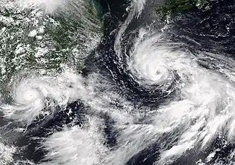 Dentro del océano Pacífico noroccidental, hay dos agencias quienes de forma separada asignan nombres a los ciclones tropicales de los cuales resultan en un ciclón con dos nombres. La Agencia Meteorológica de Japón nombra un ciclón tropical en el que se basarían en la velocidad de vientos sostenidos en 10 minutos de al menos 65 km/h, en cualquier área de la cuenca. Mientras que el Servicio de Administración Atmosférica, Geofísica y Astronómica de Filipinas (PAGASA) asigna nombres a los ciclones tropicales los cuales se mueven dentro o forma de una depresión tropical en el área de responsabilidad localizados entre 135° E y 115° E y también entre 5°-25° N, sí el ciclón haya tenido un nombre asignado por la Agencia Meteorológica de Japón[nb 2]. Las depresiones tropicales, que son monitoreadas por el Centro Conjunto de Advertencia de Tifones de Estados Unidos[nb 3], son numerados agregándoles el sufijo "W".