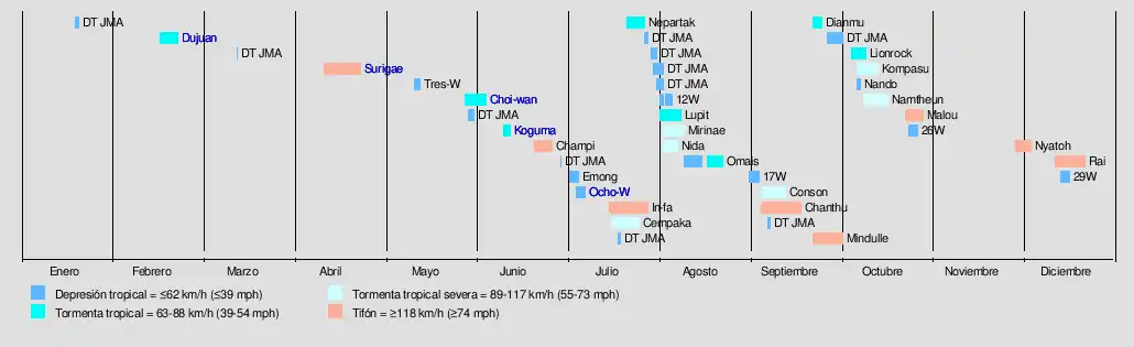 La temporada de tifones en el Pacífico de 2021 fue una temporada por debajo del promedio que produjo un total de 22 tormentas nombradas, la menor cantidad desde 2011, nueve tifones y cinco súper tifones. La primera tormenta nombrada de la temporada, Dujuan, se desarrolló el 16 de febrero, mientras que la última tormenta con nombre, Rai, se disipó el 21 de diciembre. El primer tifón de la temporada, Surigae, alcanzó la categoría de tifón el 16 de abril. al día siguiente, convirtiéndose también en el ciclón tropical más fuerte en el año. Surigae también fue el ciclón tropical más poderoso registrado en el hemisferio norte durante el mes de abril.[1] Los tifones In-fa y Rai son responsables de más de la mitad de los daños totales de esta temporada, sumando un total combinado de $2,01 mil millones.[nb 1]